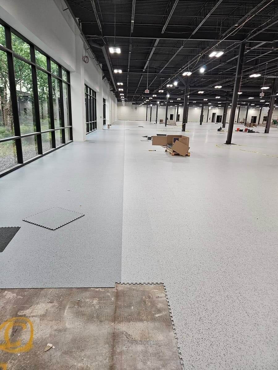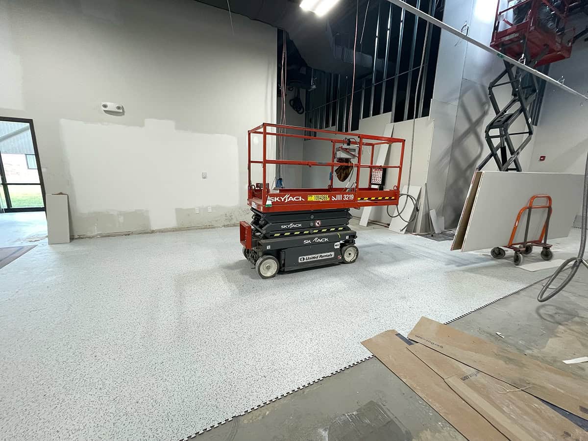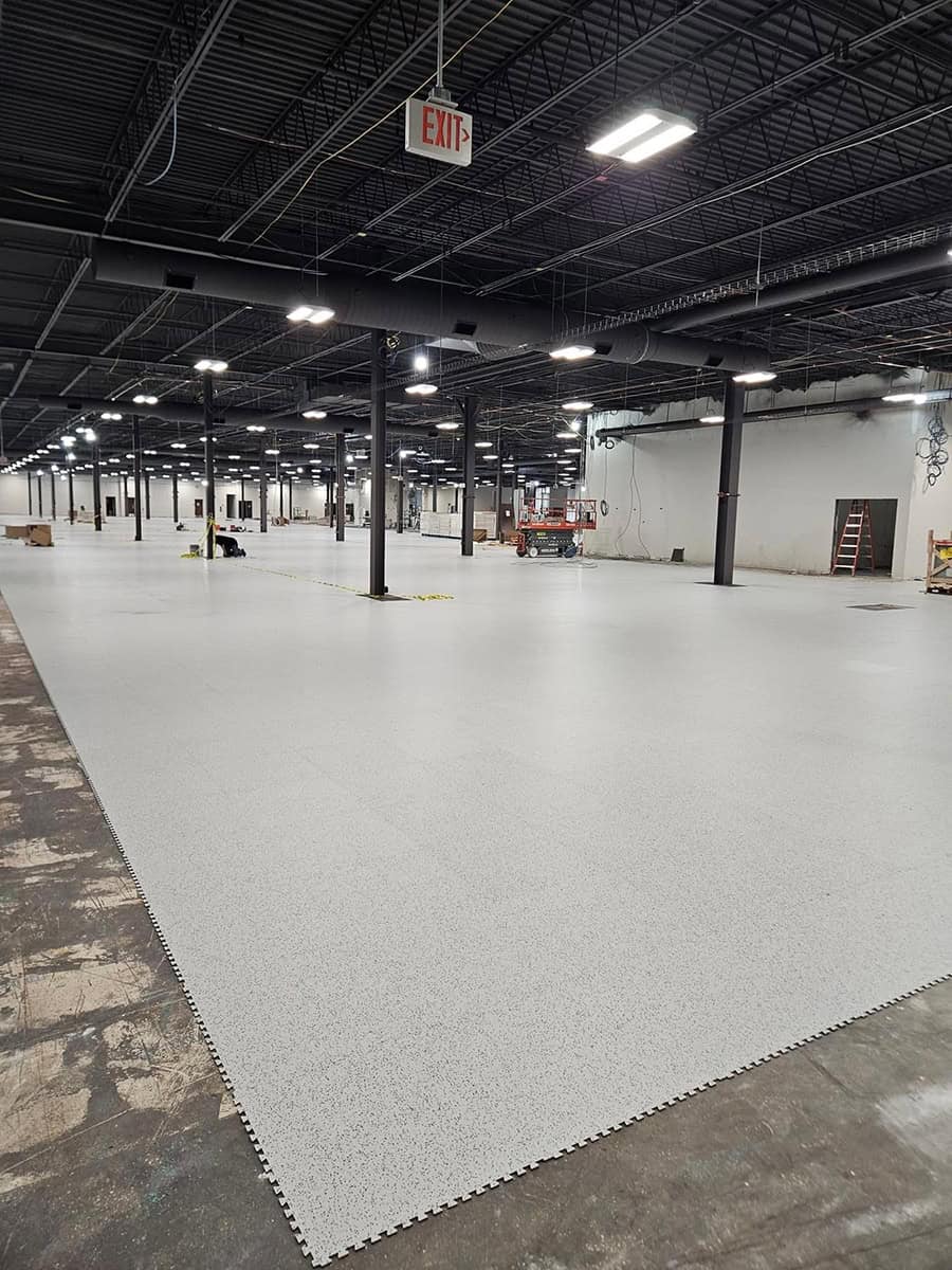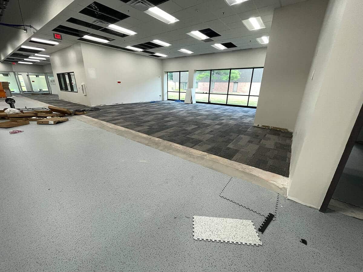 This was a challenging installation. EIT Zollner was relocating and the subfloor in the new building was in poor shape, with cracks, swales and moisture problems. Repair and floor prep would have been extremely costly. Using GroundLock interlocking tile, BG Floors was able to go directly over the old subfloor with minimal preparation. Along with saving money for the client, installing GroundLock directly over the subfloor helped to expedite the renovation schedule.