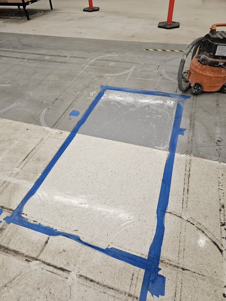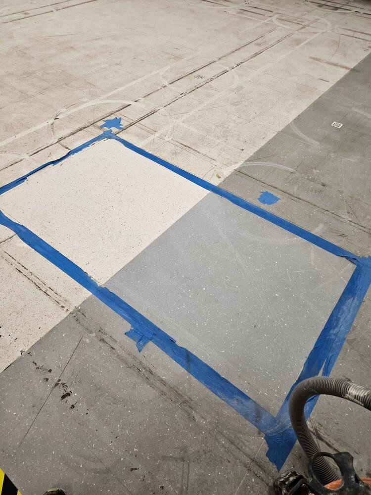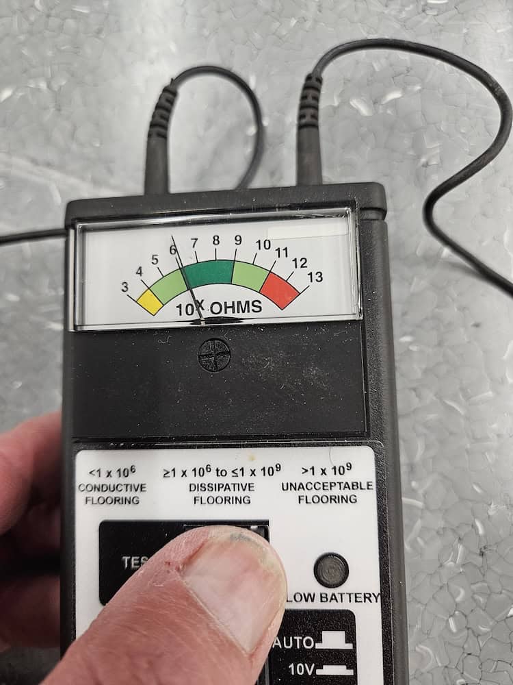 Dave believed a combination of cleaning and coating could restore the old floor. Bob returned to the site to clean a test patch and test the floor’s electrical resistance.