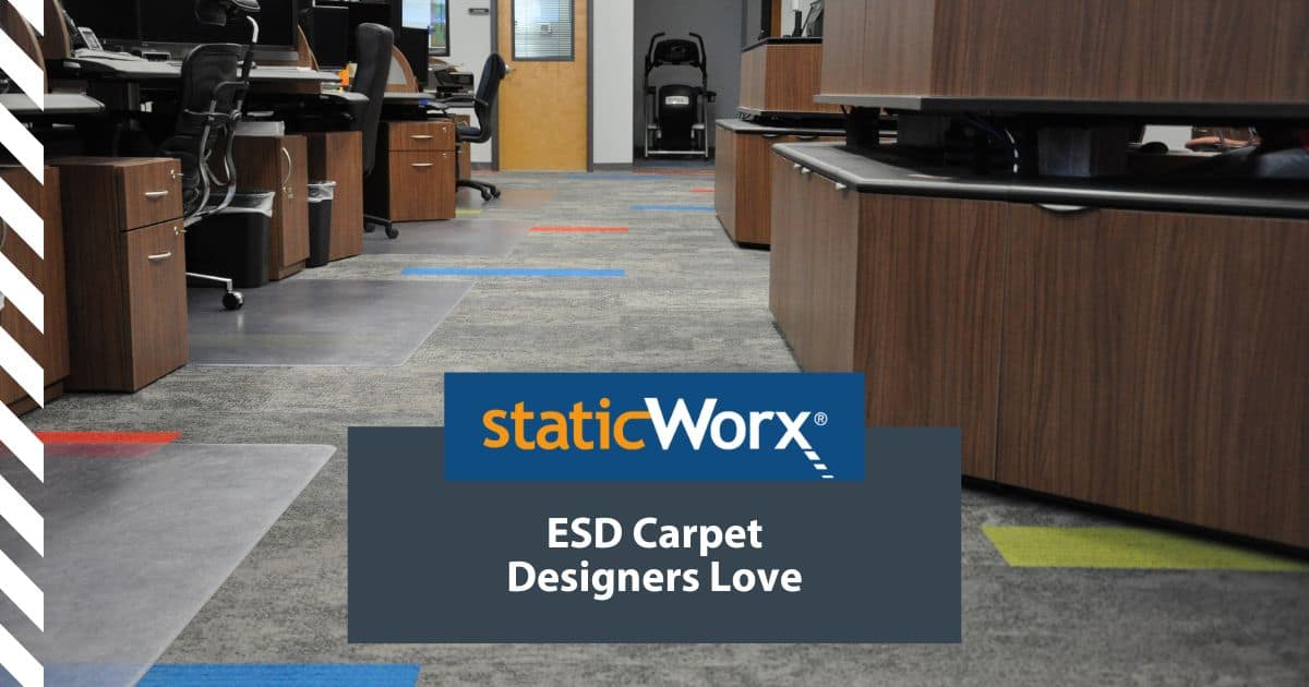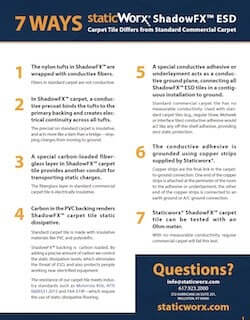StaticWorx ShadowFX static-dissipative (SD) carpet, designed to enhance the comfort of people in the space, improves the performance of electronic equipment by keeping static charges below .4 kV (400 volts).