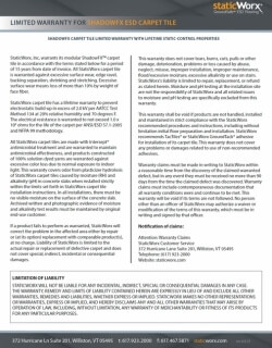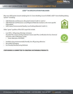 StaticWorx warranties that ShadowFX ESD carpet tile, installed and maintained as recommended by StaticWorx, will not generate above .4kV volts of static electricity, measured according to AATCC #134. The carpet face will have a minimum resistance of 1.0 x 10E6 ohms and maximum resistance of 1.0 x 10E8 ohms, measured according to ANSI/ESD S7.1-2013. ShadowFX carpet tile will provide a system resistance that complies with ANSI/ESD S97.1 test limits for meeting ANSI/ESD S20.20 (< 1.0 x 10E9).