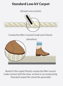 An antistatic bi-component is a type of yarn commonly found in most commercial and household carpets. The term bi-component refers to the co-extrusion of two materials within the same yarn strand. The internal cross-section of the yarn contains carbon while the surrounding fibers are composed of standard insulative nylon. The bi-component yarn provides an overall reduction in static generation—not a path to ground. Because the outer nylon insulates the internal conductive element, bi-component yarns do not discharge or conduct static electricity.