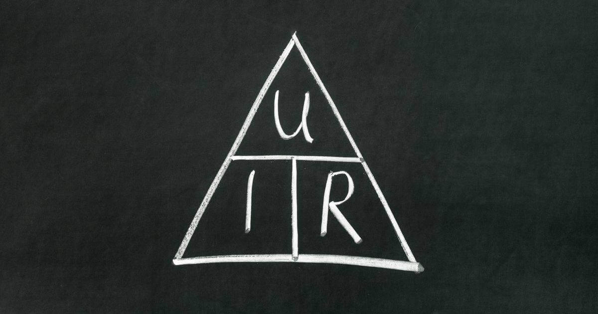 Current (i) in amps equals voltage (V) divided by resistance (r) in ohms (Ω)