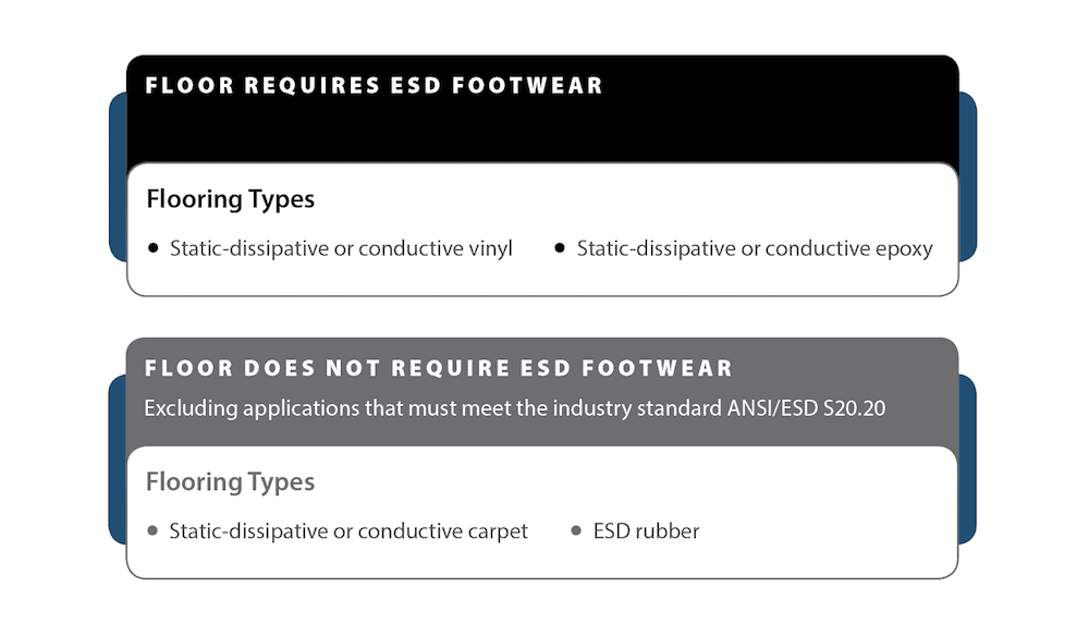 Used in conjunction with floors, such as static-dissipative or conductive vinyl, that do not inhibit static generation, ESD footwear prevents static generation when people walk.