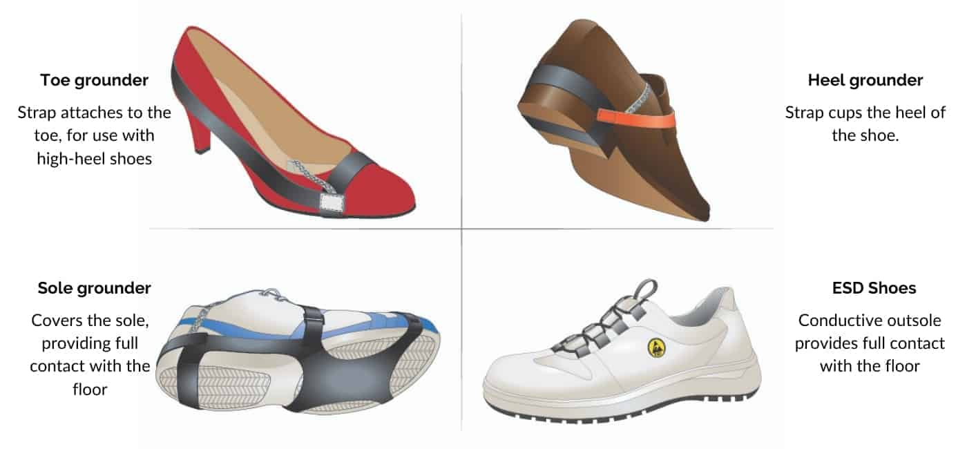 ESD footwear comes in several forms: heel straps, toe straps, sole straps, and shoes. Benefits and performance vary, with buyers selecting footwear based on their needs and priorities.