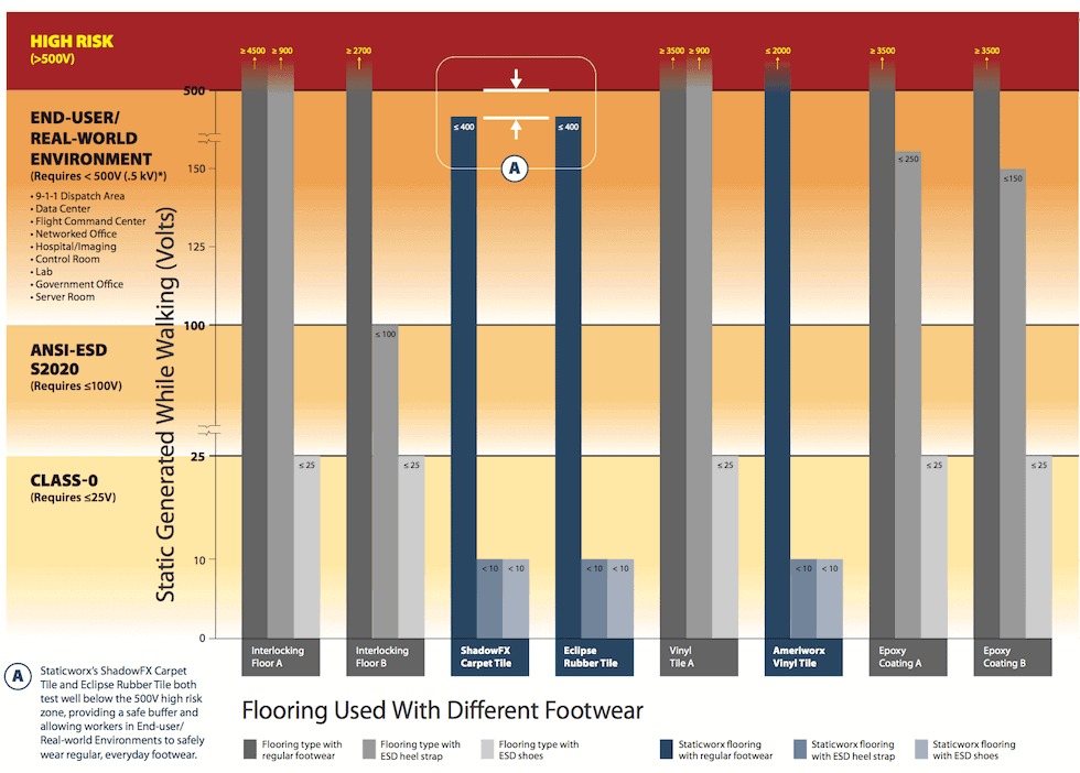 In environments where people wear regular footwear, static-dissipative carpet tile and ESD rubber are the best ESD flooring choices. Static-control carpet and ESD rubber provide a safe pathway to ground while also reducing walking body voltage—regardless of footwear.
