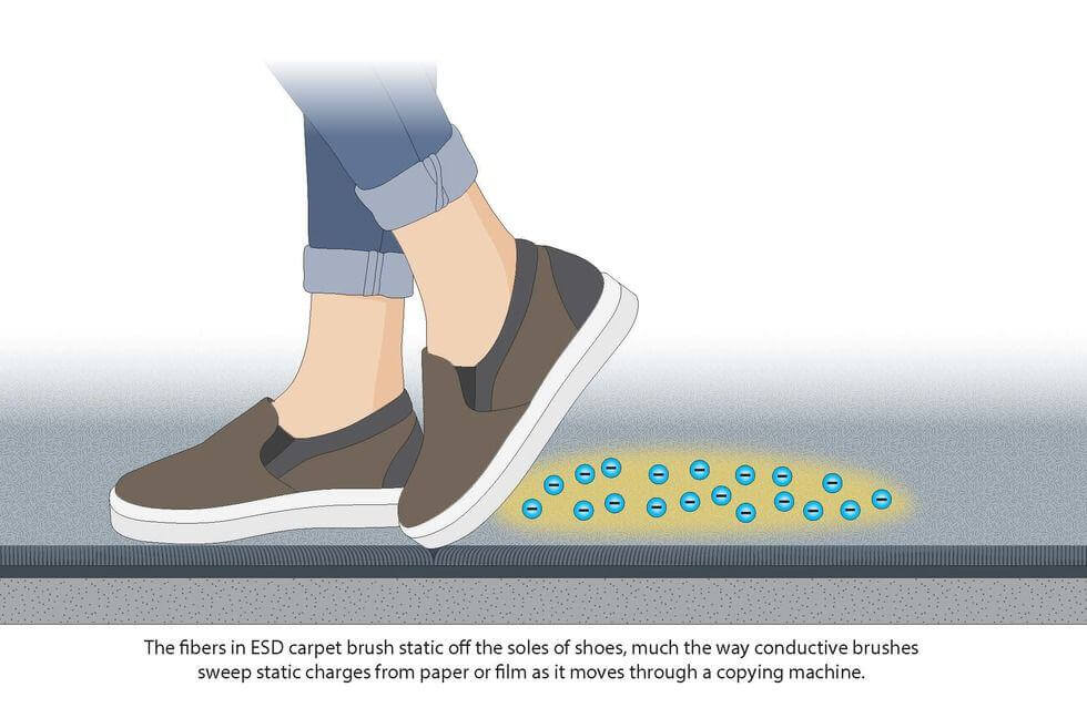 Static-dissipative carpet tiles contain thousands of dissipative fibers that sweep static off the soles of shoes as people walk, and direct the charge safely to ground—much the way small brushes eliminate static on high-speed copiers as paper is fed into the collator.