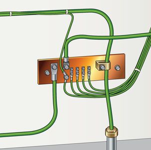 Attach the copper-grounding strap to the exposed end of the rod using a grounding clamp, usually sourced from the same manufacturer as the grounding rod (refer to www.stormgrounding.com.) If necessary, a #10 or #12 wire can be attached to the grounding rod.