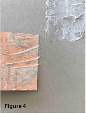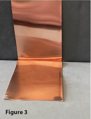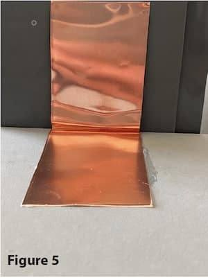 StaticWorx most often supplies a special adhesive-backed copper tape for grounding floor coating installations. Affix the grounding strap to the epoxy primer by removing the backing and exposing the factory-applied adhesive. Run the copper strip down the wall and lay it directly onto the floor, extending approximately 6 inches or more into the room. In most cases, this will create a 90-degree right angle perpendicular to the wall (fig. 3). When installing a non-adhesive grounding strap, a small amount of conductive adhesive shall be used to secure the copper strap in place (fig. 4 & 5).