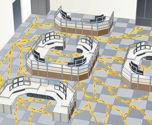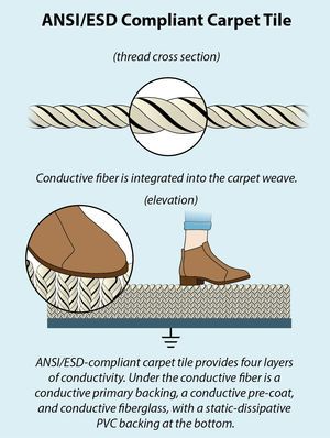 Conversely, carpet tile in the static-dissipative range may be preferred over some conductive carpet. If the carpet tile is too conductive—or resistance varies from tile to tile, with overly conductive “hot spots”—the floor could pose a safety risk. In fact, the U.S. government and telecommunications industry prohibit the use of conductive floors near electrified equipment.*