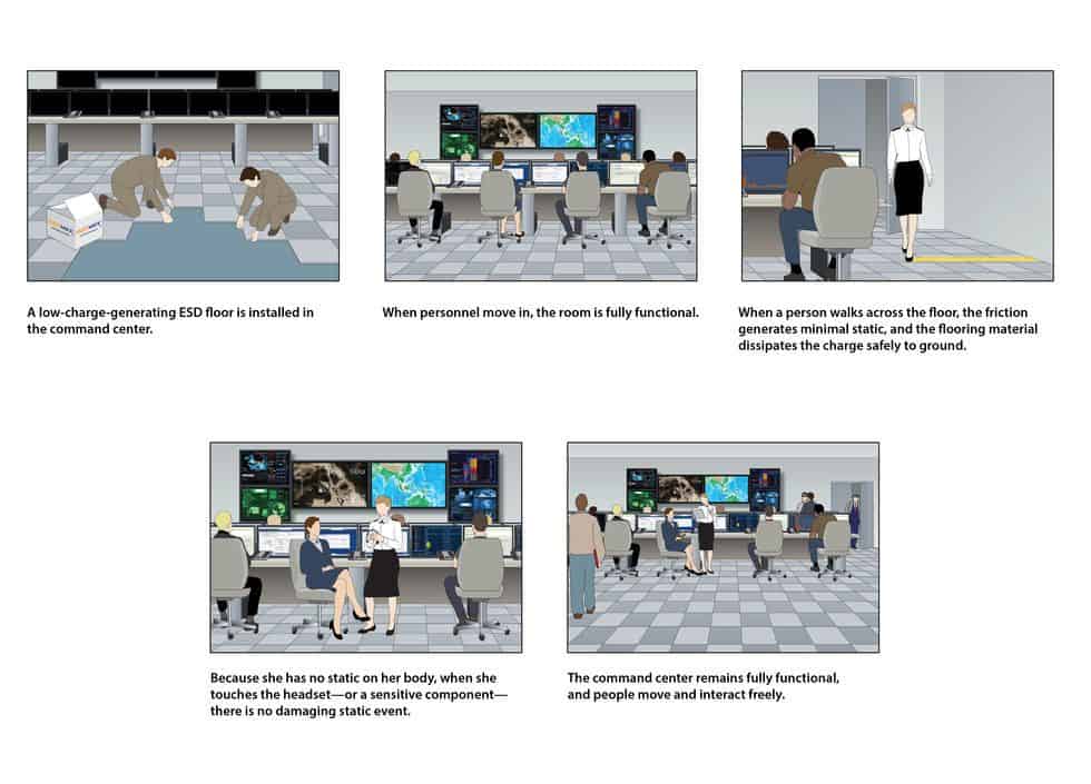 Most static in a workplace is generated by people walking on the floor. Because the floor is a central place for static generation, an ESD flooring system is the first line of defense in ESD prevention. Static control floors have two equally important functions: 1) they are grounded and remove static from shoe soles and the wheels on rolling carts and discharge static to ground; 2) they prevent static from building in the first place.
