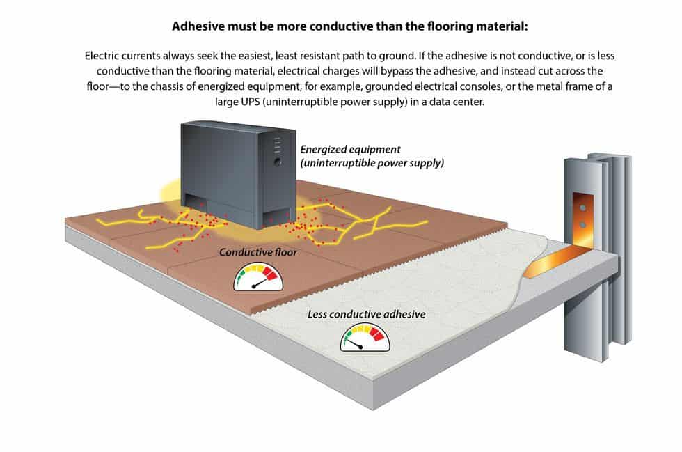 If the adhesive is not conductive, or the adhesive underlayment is less conductive than the flooring material, electrical charges could bypass the adhesive, preferring the less resistive route, across the top of the floor—to the chassis of energized equipment, for example, or grounded electrical consoles, or the frame of a large UPS (uninterruptible power supply) in a data center.