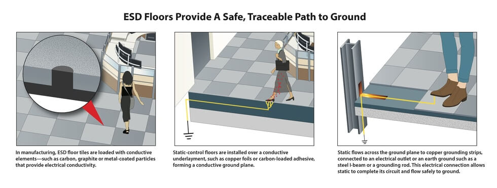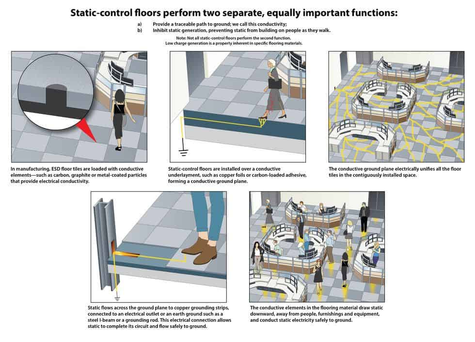 Floor materials with conductive elements transport static charges to ground, preventing random electrostatic discharge (ESD) events from harming electronic equipment. Static-control floors contain carbon veins, filaments or fibers that draw static away from shoe soles and wheels on moving carts, pull charges downward, through the thickness of the flooring material, across an underlying ground plane to copper strips at the perimeter of the room, to an earth ground.