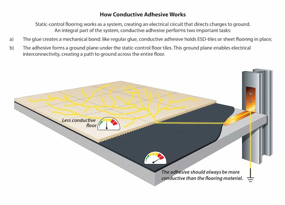 Using an adhesive that’s not conductive or is less conductive than the flooring material could pose a safety hazard.