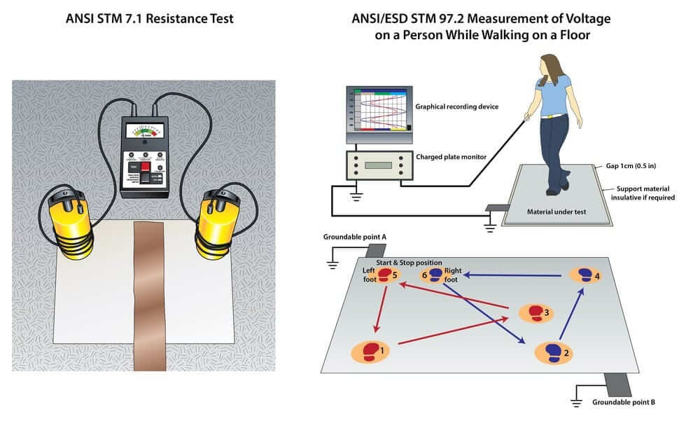 After installation, an ESD floor should be tested with an ohm meter to confirm that the floor provides the electrical resistance to meet the standard for the application and specifications provided by the manufacturer.