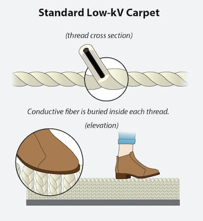 Low-kV (office-grade) carpet is designed only to prevent nuisance shocks to people, not to dissipate static electricity. It cannot be grounded and does not provide the level of charge reduction required to protect sensitive electronic equipment.