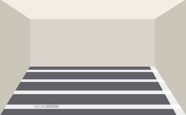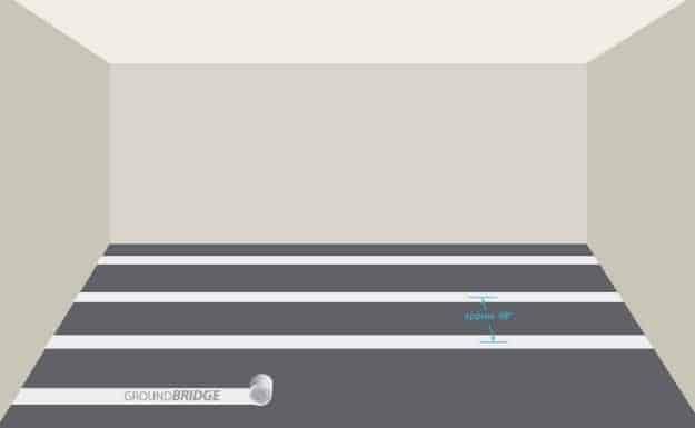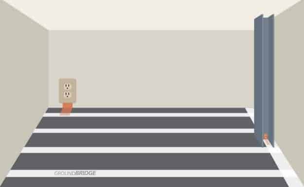GroundBridge (or a conductive subfloor) is grounded using 24″ copper tape, installed at a rate of one strip per 1,000 sq. ft. Copper tape can be connected to a grounded electrical outlet or a grounded metal structure, such as an I-beam.
