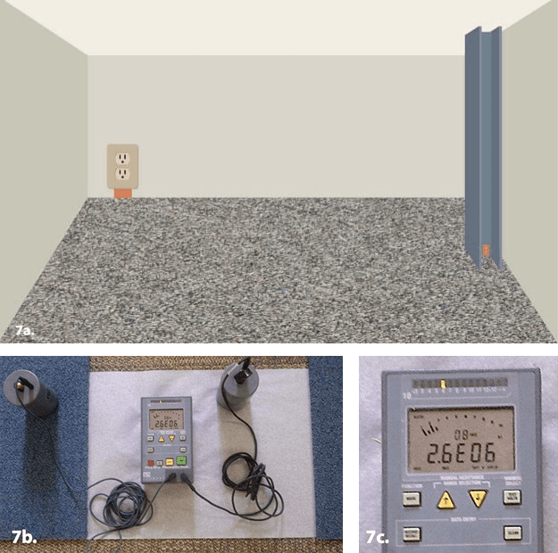 After installation, the floor is tested for electrical resistance using an ohm meter in accordance with ANSI/ESD STM 7.1. Using a 100V test voltage, the floor should measure 1.0 × 10⁶ to 1.0 × 10⁸ ohms, with multiple readings taken across the space.