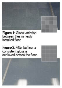 All new installations of solid vinyl tile need to be buffed per StaticWorx Initial Floor Maintenance guidelines in order to attain a consistent gloss level across the entire floor; this is particularly true with darker gray and blue-colored floor tiles. This procedure will both remove the factory finish and level off natural microscopic pores and valleys in the surface of the tile in order to achieve visual uniformity (figure 2).