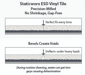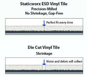 The only way to prevent gaps is by producing tile with 90-degree angles on all four edges—through the entire thickness of the tile. That is what precision milling does. If you ran your hand down a stack of precision-milled tile, the surface would feel as smooth and glassy as a granite counter. AmeriWorx ESD vinyl tiles—also known as an antistatic vinyl tiles or static-control vinyl tiles—rest snugly against adjacent tiles, eliminating unsightly gaps, while providing extreme resistance against heavy weight loads. Our precision-milled tile is rated at over 2500 PSI—everywhere on the tile, not just the center.