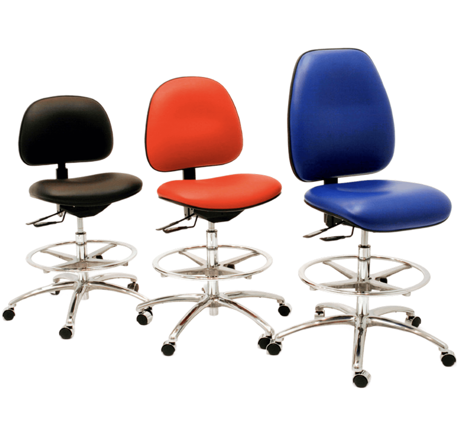 Quick-change upholstery system allows individual cushions for each shift worker. Easy to clean for lab and cleanroom environments.