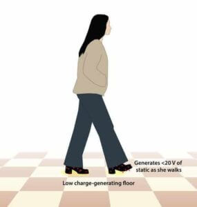 The conductive elements in a flooring material draw static to ground. But conductivity is only half the story. The other half concerns charge generation. Charge generation refers to the amount of static that’s generated when people walk across the floor (walking body voltage).
