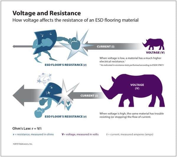 - Note: Keep in mind that in actual installations, environmental factors such as moisture, RH, and wet shoes can and will reduce the resistance of any static-control floor. When resistance is reduced, electrical current increases.