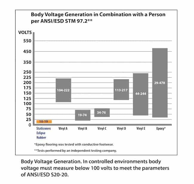 All ESD flooring options should be tested and evaluated based on the type of footwear that will be used in the space. Epoxy coatings and ESD vinyl offer no static protection without the (enforced) use of special static-control footwear.