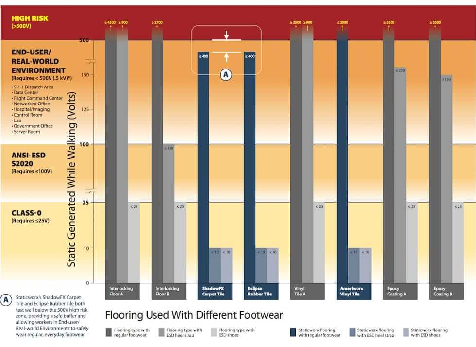 Note1: Always request independent lab test reports. Some epoxy coatings and Interlocking ESD vinyl floors do not meet the maximum 100 volt charge generation requirements of ANSI/ESD S20.20 when tested with ESD footwear.